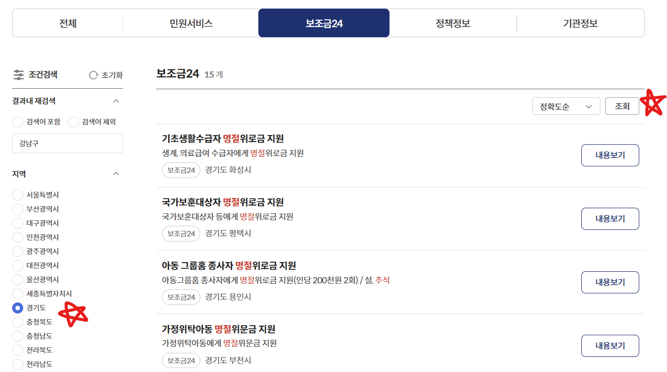 2. 보조금 24 페이지 검색창에 '명절' 이라고 검색하기