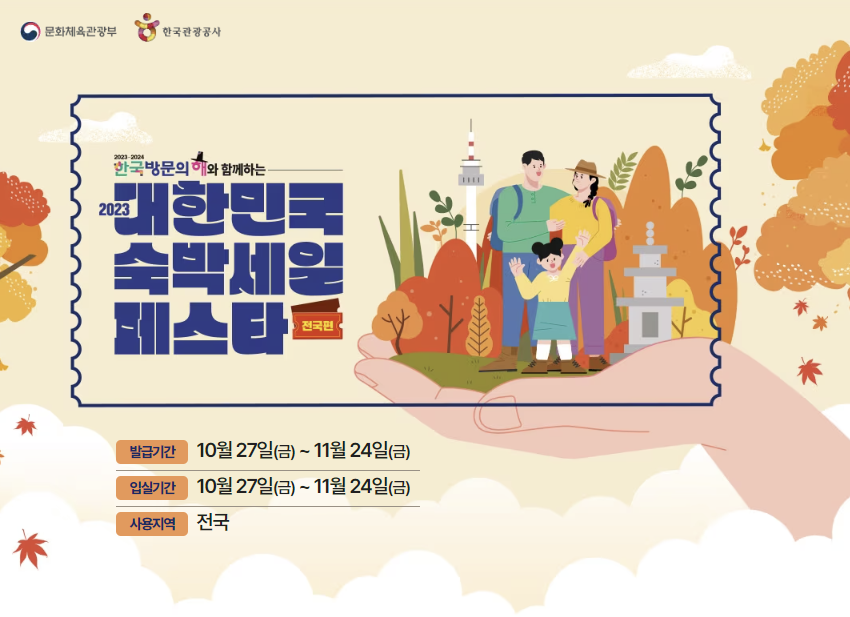 대한민국 숙박세일 페스타(전국편)가 연이어 진행되어 숙박할인권이 추가 배포되었습니다.