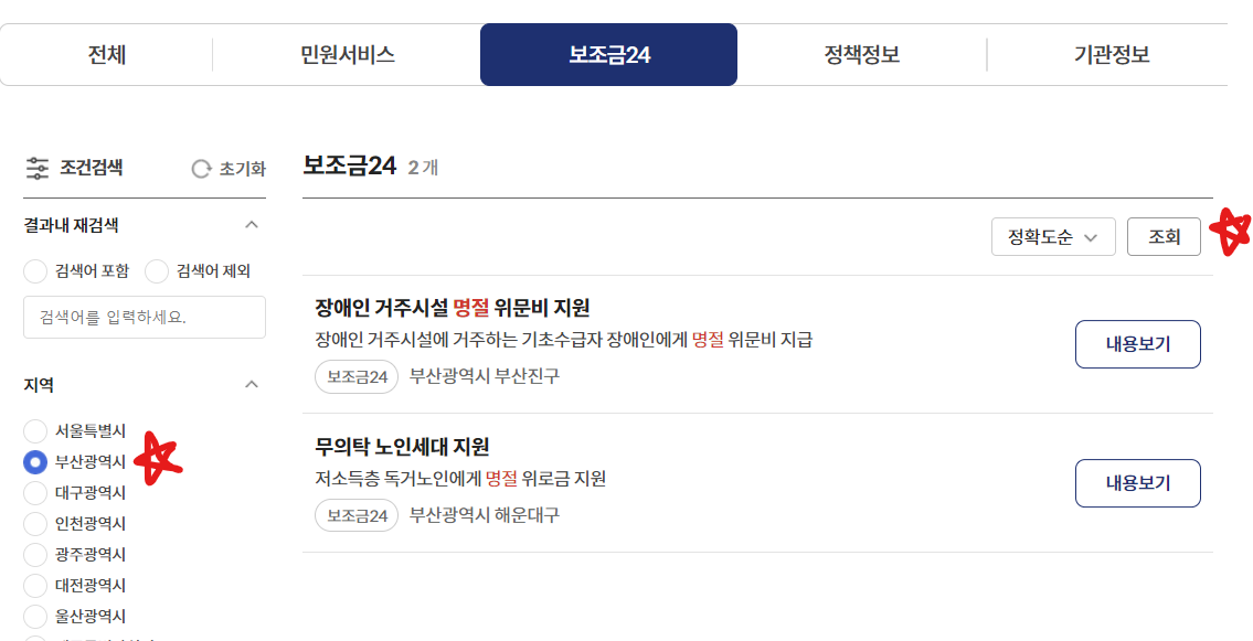 2. 보조금 24 페이지 검색창에 '명절' 이라고 검색하기