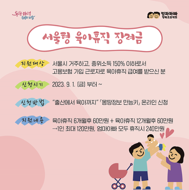 서울시에 지급하는 육아휴직지원금(육아휴직장려금)받고 오늘도 육아 화이팅하세요!