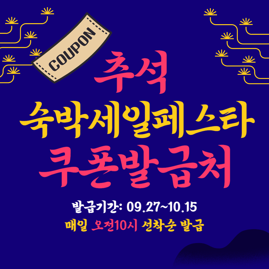 * 추석 숙박할인권 발급 및 숙박예약 : 09.27 ~ 10.15 (매일 오전 10시 선착순 오픈)
